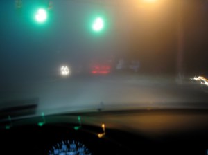 I was driving through thick, heavy mist. The mountainous air was cold but my car was warm, and I knew my way home (or at least, my GPS did).