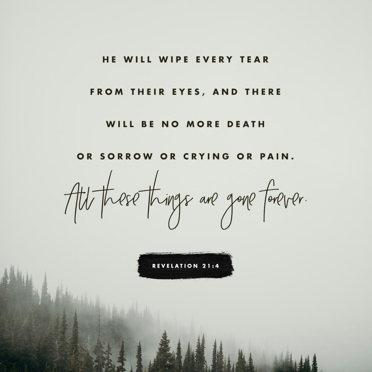 “He will wipe every tear from their eyes. There will be no more death’ or mourning or crying or pain, for the old order of things has passed away.”